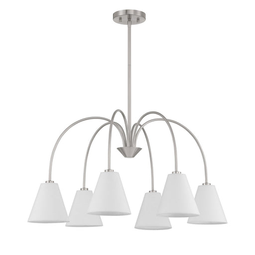 Style cascades down with the slender and curving arms of this 6-light chandelier, which are finished in Brushed Nickel and decorated with white lin...