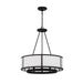 Showcasing a classic drum pendant, the Bryant is crafted with a white glass shade and black steel frame. The outer drum surrounds an inner suspension of candelabra sockets. The contrasting materials and bold graphic lines provide a design-driven style and a striking visual accent to many interior settings.