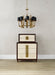 The Umberto Chandelier has an abstract appeal that can cross many stylistic lines. Made of wrought-iron in a brass finish, this eight-light gold chandelier has black metal shades set into the angular composition made of thin spiked lines.