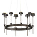 The Coterie Bronze Chandelier is made of wrought iron in a bronze finish with a contemporary gold finish on the inside of the shades to bring added warmth to the illumination. Clarence Mallari was looking to design an elegant black chandelier with innovative technology. Elements that bring the fixture elegance are the tall and thin arms, the small-scaled shades, and the aircraft cable on which it is hung, the innovation is thanks to the particular LED bulbs he chose, which are included with the fixture. An outstanding detail is how Mallari culminated the top and bottom of the large ring with rims, which extend both inside and out.
