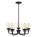 The Belton five light single tier chandelier in midnight black enhances the beauty of your home with ample light and style to match today's trends. Influenced by the vintage industrial designs of early 20th Century America, the transitional Belton lighting collection has seeded glass shades and Midnight Black finish, adding a layer of retro design to the warm look.