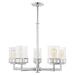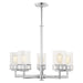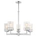 The transitional style of the Harding five light chandelier features an eye-catching clear seeded glass shade floating inside a unique double forged square design in a polished chrome finish.