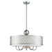 Our Arabesque five light pendant with down light will add refined style and a hint of mystery to your decor. The off-white fabric hardback shade creates a warm illumination, while the light brings to life the intricate brushed nickel cutout pattern.