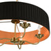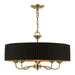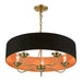 The five-light Harrington pendant chandelier combines floral details and casual elements to create an updated look. The hand-crafted black fabric hardback pleated drum shade is set off by an inner silky orange fabric that combines with chandelier-like antique brass finish sweeping arms which creates a versatile effect. Perfect fit for the living room, dining room, kitchen or bedroom.