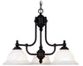 This chandelier brings a clean transitional luminance to your decor. The black finish contrasts with white alabaster glass resulting in a distinctive lighting accent.