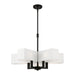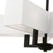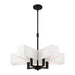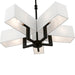 This chandelier from the Rubix collection has a crisp, clean look and contemporary appeal. The angular arms feature a black finish. The off-white fabric hardback shades offers warm light for your surroundings.