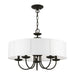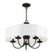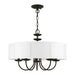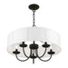 The five-light Brookdale pendant chandelier combines floral details and casual elements to create an updated look. The hand-crafted off-white fabric hardback drum shade is set off by an inner silky white fabric that combines with chandelier-like black finish sweeping arms which creates a versatile effect. Perfect fit for the living room, dining room, kitchen or bedroom.