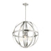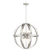 The Stoneridge collection hints at a casual rustic vibe. It features beautifully rounded steel straps held together by rivets. The cluster of lights are reminiscent of the sputnik design from the 50s and 60s mid-century modern era. This six-light globe pendant chandelier is shown in a brushed nickel finish. It will be a great feature in your modern loft or cabin as well as any transitional style interior.