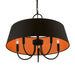 The five-light Palma pendant chandelier has a modern and retro appeal. The hand-crafted black fabric hardback angled shade is set off by an inner silky orange fabric that combines with chandelier-like black finish sweeping arms which creates a versatile effect. Perfect fit for the living room, dining room, kitchen or bedroom.