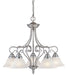 Classic brushed nickel five light chandelier paired with white alabaster glass. Timeless in its vintage appeal, this light is stylish for both new and restored homes.