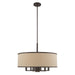 Update your decor with this sleek pendant light design. The angular frame comes in a bronze finish which nicely complements the hand crafted parchment color fabric hardback shade which holds six bulbs and one downlight to maximize your light output.