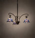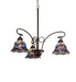 This Peacock Feather design is one of Louis Comfort Tiffany's favorite patterns. Splendid colors of Mauve with Beige, Pink, Orange, and Gray art glass adorn the bottom of the shade while feathers feature Turquoise Blue and Purple. A scalloped crest of art glass featuring Purple, Blue, Orange and Green edge a ring of spectacular plumage of the undulating shade. This shades are created using the famous Meyda Tiffany copperfoil construction. Enhanced with a Mahogany Bronze finish. Overall height ranges from 34 to 71 inches as chain length can be easily adjusted in field. The Tiffany Peacock Feather Chandelier is featured in our American designed, handcrafted Tiffany Reproduction Lighting Collection. UL and cUL listed for dry & damp locations