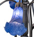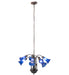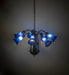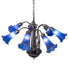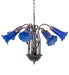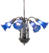 One of the most popular Louis Comfort Tiffany styled lamps on the market today, recreating his famous Favrile design from the early 1900's. This softly mottled Indigo Blue shaded Seven Light Chandelier offers an attractive, delicate design featuring shades mouth blown of fine art glass. Lily shades are suspended from gracefully curved arms in this fixture finished by hand in Mahogany Bronze.