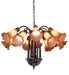 Recreating the famous Tiffany design from the early 1900s. This elegant chandelier features 12 Amber Favrile Style art glass shades. An elegant cast metal hub embraces the Lily shades with floral-style fitters finished by hand in Mahogany Bronze. The Pond Lily Chandelier is included in our American-designed, handcrafted Favrile Glass Lighting Collection. UL and cUL listed for dry and damp locations. Each shade is a unique work of art with color variations based on natural ingredients inherent in the glass. Please contact us if color matching is critical when ordering multiple items.