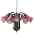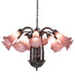 One of the most popular Louis Comfort Tiffany styled lamps on the market today, recreating his famous Favrile design from the early 1900's. This softly mottled Cranberry Red shaded Twelve Light Chandelieroffers an attractive, delicate design featuring shades mouth blown of fine art glass. Lily shades are suspended from gracefully curved arms in this fixture finished by hand in Mahogany Bronze.