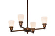 Bring home an era of style and charm with this chandelier which features four goblet styled shades in Opal White blown-glass and embraced by Solid Brass hardware that is featured in a Vintage Copper finish. The fixture is ideal for illuminating counters, islands, dining tables and other spaces. This American-made Revival fixture is custom crafted in in Upstate New York. Custom sizes, styles and colors are available, as well as dimmable energy efficient lamping options such as LED. The chandelier is UL and cUL listed for damp and dry locations.