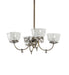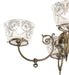 Inspired by lighting fixtures that were powered with both gas and electricity during a transitional period. Today this classic chandelier features four shades which reveal a lovely Wreath and Garland pattern in Frosted and Clear glass. Handcrafted of Solid Brass in our 180,000 square foot manufacturing facility in Yorkville, NY. Shade colors, metal finishes and fixture sizes can be customized. This fixture is UL and cUL listed for damp and dry locations.