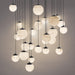 Embracing the art of light, a multitude of natural Spanish Alabaster orbs shimmer at different heights from a multi-point canopy, casting an entrancing celestial glow.