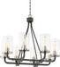 Nuvo's Sherwood 8 light chandelier is a sophisticated lighting solution for inside the home. Illuminate living rooms, dining rooms, and foyers, with this iron black fixture featuring brushed nickel accents. Eight T9 bulbs are presented behind the clear glass of this charming chandelier. Contemporary and elegant, the Sherwood collection adds style to any home decor.