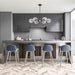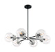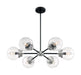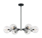 The six-light Axis chandelier has a distinct finish combination of Matte Black with 3 Brushed Nickel shade holders and cluster. The clear globes accent the minimalist appeal of this series. They will fit in a variety of design styles ranging from mid-century modern to clean contemporary designs. The chandelier is the perfect size, 29.625 inches in diameter. This distinctive chandelier will anchor any interior design.