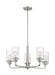 The Sommerset Brushed Nickel five-light chandelier features flat arms and a clear glass shade enclosure with decorative thumb screws. The sleek, streamlined appearance of the Sommerset chandelier compliments both modern and transitional styles. Sommerset can also be at home in a coastal setting. 24 inches in diameter, the Sommerset is the perfect light source over a dining table or used in multiples in a linear design.