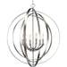 Inspired by ancient astronomy armillary spheres, the interlocking rings pivot for an infinite variety of positions. Six-light chandelier pendant in Burnished Silver is ideal for installations over a farmhouse table, dining room setting or kitchen island.