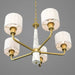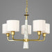 An intriguing fashion-forward lighting collection, Palacio pairs a Vintage Gold finish with faux white marble columns for a stunningly elegant design. White silk shades complement gold accents to create a statement-making style. The five-light chandelier is Ideal for a variety of interiors.