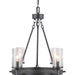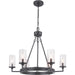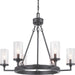 A display of substantial style in a six-light chandelier, Gresham Collection's frame was inspired by the elegance of traditional iron structures. Specific attention to forging details creates a distinctive collection for Transitional and Farmhouse interior spaces. Seeded glass shades and a Graphite finish pair together to complete the look.