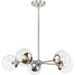 Long lines ending in clear glass globe shades define the modern aesthetic of the Atwell Chandelier. One central stem is capped by clear glass, creating bright illumination from the light source glowing within. Atwell fits beautifully into mid-century modern and contemporary settings, delivering ambient illumination to foyers, dining rooms and living rooms.