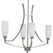 Four-light linear chandelier is characterized by its unique tulip-shaped glass shades and bold, sculptural design. Rectangular arms flow through the fixture and consist of strap accents. Etched white glass brings out the beauty for this Brushed Nickel fixture while also providing ideal illumination. Wisten Collection can be used to update a single room or an entire home to create a designer coordinated look.
