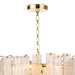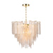 Panes of striking water glass with white swirls adorn the large Glacier chandelier to create a dynamic piece full of movement. The glass diffuses the light, providing a soft glow to the area around it, perfect for a foyer or living room.