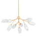 Inspired by the sprightly buds of a dill plant, individual clusters of stems branch away from one another in the show-stopping Aldean. Each shade is handcrafted from Cloud Glass and supported by a framework finished in Vintage Gold Leaf. When illuminated, this fixture casts shadows on the ceiling, introducing drama to any space. Aldean is available as a 3-light sconce and a 9-light or 18-light chandelier.