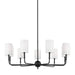The Foxdale nine light single tier chandelier in Midnight Black encompasses the new traditional style with flawless execution. Refined and clean-lined, this classic silhouette is timeless without being stuffy. Perfectly transitional, this collection can be placed in any home regardless of style. Topped with White Linen Shades to complete the design.