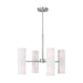 Sleek and modern, this contemporary collection features cylindrical linen shades and a visible flat spine for a clean look. It features a candelabra-style fixture with four sleek arms referencing mid-century modern design. On the end of each arm, frosted glass shades direct soft light in both directions.