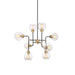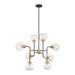 8-Light 34" Adjustable Geometric Globe Chandelier with Clear Glass Globes and Polished Brass & Matte Black Metal Finish.