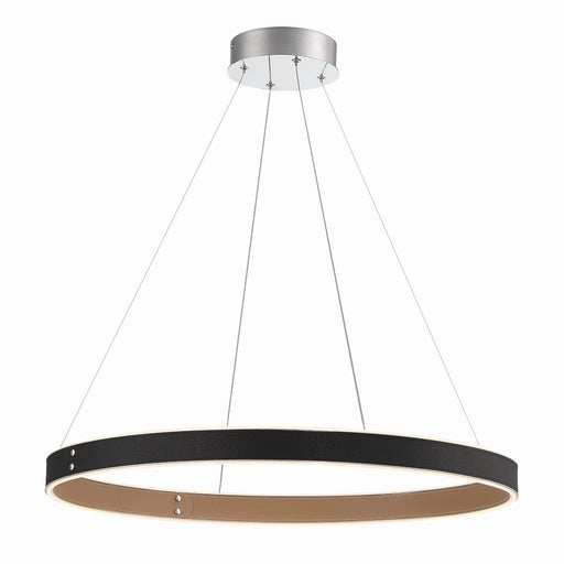 A black ring of LED light is suspended by two satin nickel or gold-finished metal rods on either side. An unconventional approach to a simple conce...