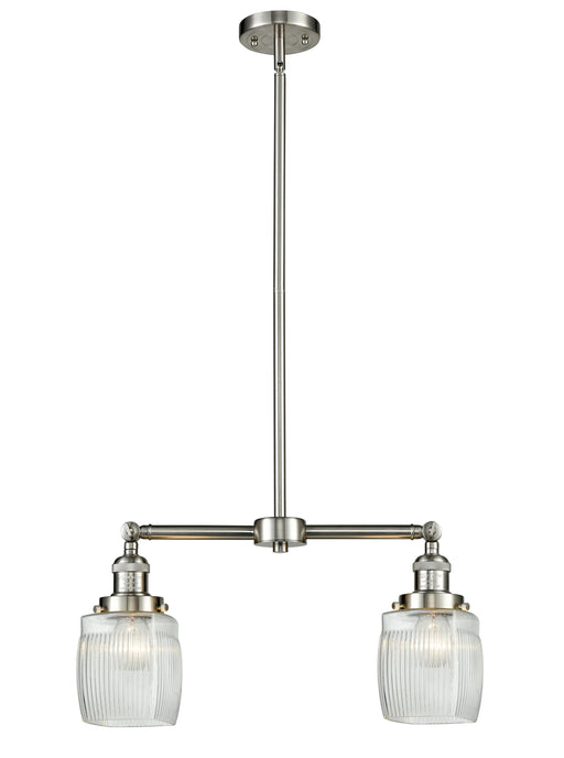 Colton - 2 Light - 22 inch - Brushed Satin Nickel - Clear Halophane Shade - Stem Hung - Island LightDetails:Product Type: Glass DownFinish: Brushed...