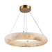 Hanging gracefully from the ceiling, the Camila collection exudes an ethereal glow, casting a soft and warm ambiance. Its meticulously carved alabaster diffuses the light in an elegant dance of shadows, creating a captivating interplay of textures. The chandelier's seamless design and timeless beauty make it a focal point, blending sophistication with a touch of celestial charm. 19" diameter ring type LED chandelier shown. (height adjustable via push pin cables)
