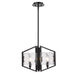 The beauty of water is the inspiration behind the contemporary Varsha collection. Create a relaxed mood with this modern interpretation of refractive water. Drift on the waves of the thick artisan glass with no worries of being swept away by a current. Strong geometric arms carry the Hammered Water Glass while veiled screws hold the panels in place. The frame's repetitive boxes converge to create a center column. Strong candelabras sit upon wide cups that are partially concealed behind the beautiful glass. The smooth matte black finish offers a sophisticated feel. This 3-light pendant is perfect for a kitchen nook or hung as a pair over an island.