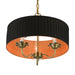 The three-light Harrington pendant chandelier combines floral details and casual elements to create an updated look. The hand-crafted black fabric hardback pleated drum shade is set off by an inner silky orange fabric that combines with chandelier-like antique brass finish sweeping arms which creates a versatile effect. Perfect fit for the living room, dining room, kitchen or bedroom.