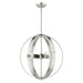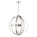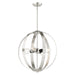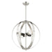 The Modesto collection hints at a casual mid-century modern vibe. It features steel straps that form beautiful circular shapes. The exposed bulbs and two-toned combination of finishes create a fashionable statement for today`s interiors. This four-light globe pendant chandelier is shown in a brushed nickel finish with black accents. It will look fantastic in your mid-century modern loft living room, dining room, kitchen or any contemporary style interior.