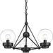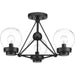 Spatial showcases a modern form that complements Urban Industrial and Bohemian styles. Overscaled geometric frames feature designs inspired by metal trusses and the art of engineering. A Matte Black finish is highlighted by clear globe shades. The three-light semi-flush convertible fixture is ideal for foyers and entryways.