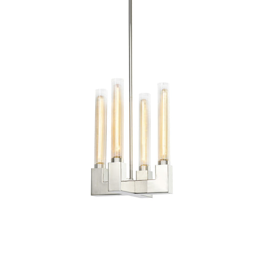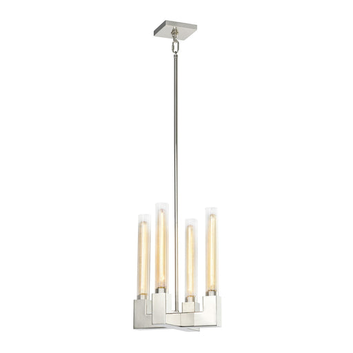 4-Light 12" Arm Styled Square Pendant with Clear Fluted Cylindrical Glass Shades Settled on a Sleek Polished Nickel Arm Styled Frame.Details:Produc...