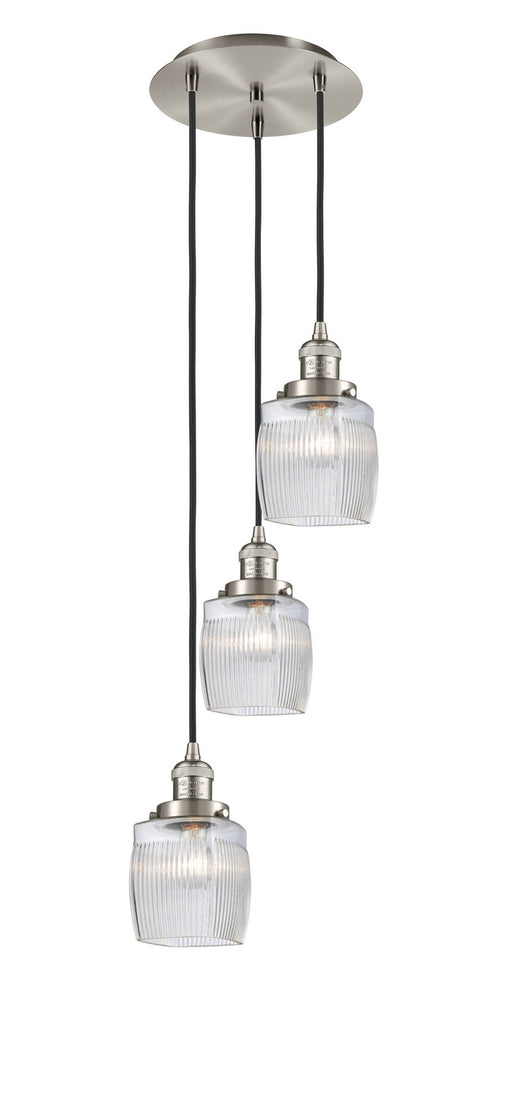 Colton - 3 Light - 12 inch - Brushed Satin Nickel - Clear Halophane Shade - Cord hung - Multi PendantDetails:Product Type: 3 Light ClusterFinish: B...
