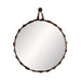 Equal parts classic and masculine this mirror is a simple design with a twist—literally! Bands of tobacco-hued leather surround the plain glass mirror and is topped with a brass- plated knob and matching leather loop so it has an almost equestrian feel. The knob is purely decorative though because the base is mounted with a security cleat. It is also available in a smaller version (4712).