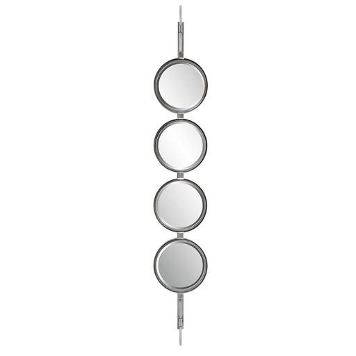 Contemporary In Style, This Mirror Features A Sleek Iron Base With Linear Metal Accents. The Piece Is Finished In Silver Leaf With Four Round Bevel...