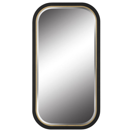 The Nevaeh Mirror Displays An Elegant Curved Profile With A Satin Black Finish, Accented With A Petite Gold Leaf Inner Edge. Mirror Features A Gene...