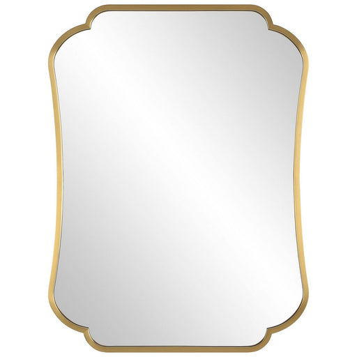This Shapely Mirror Features An Iron Frame Finished In A Heavily Antiqued Gold With Outer Curves For An Updated Appeal To The Traditional Rectangle...