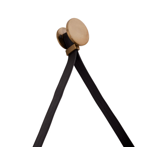 Gaze upon the sophistication of this unique wall mirror. The mirror itself is framed in warm, antique brass-finished iron, with a black leather loo...