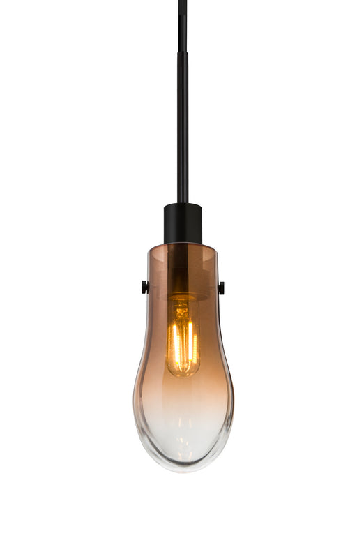 The Geno Amber Vapor Pendant is a modern look composed of a transparent amber elliptical shape European glass, with a mystical vapor-like patternin...
